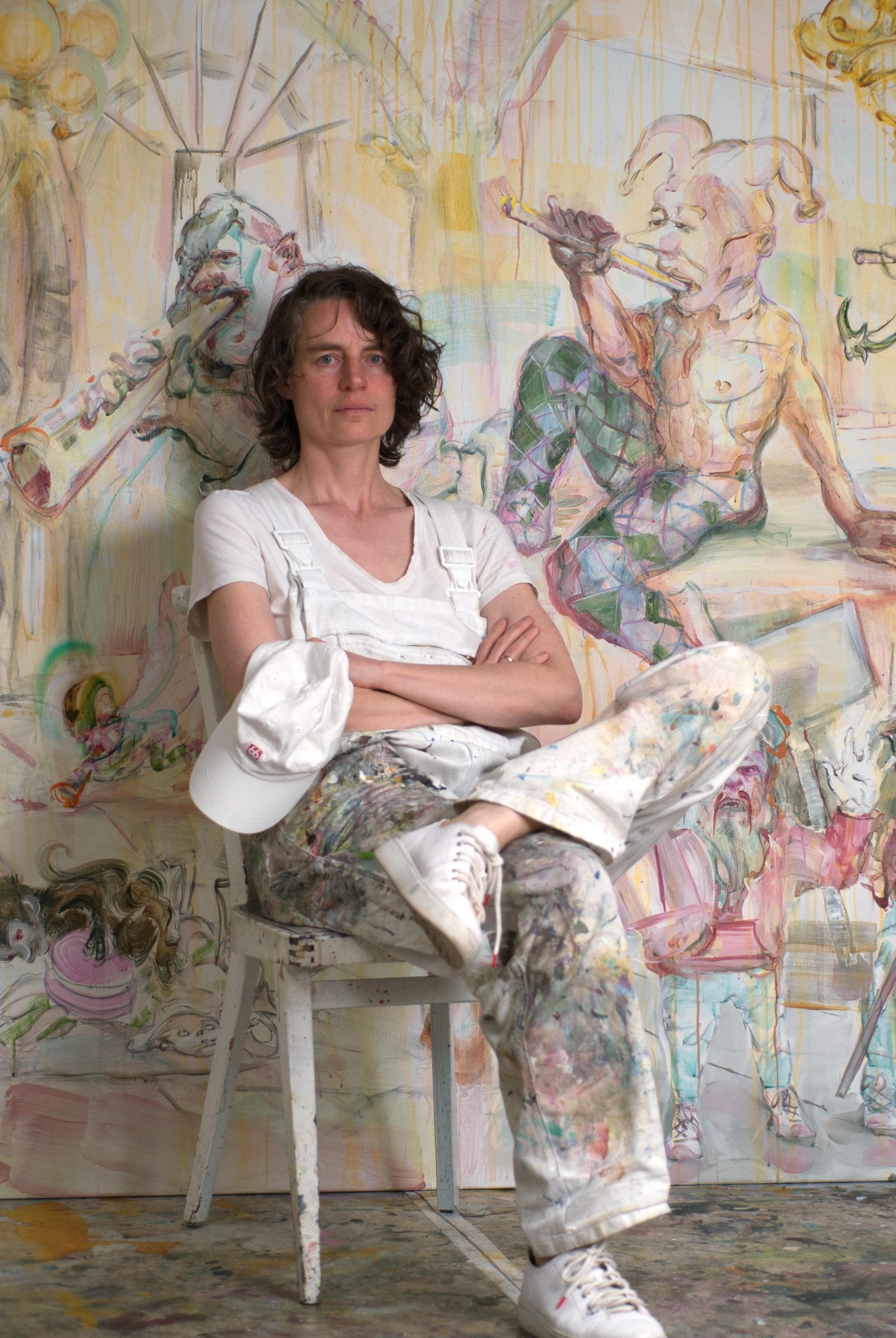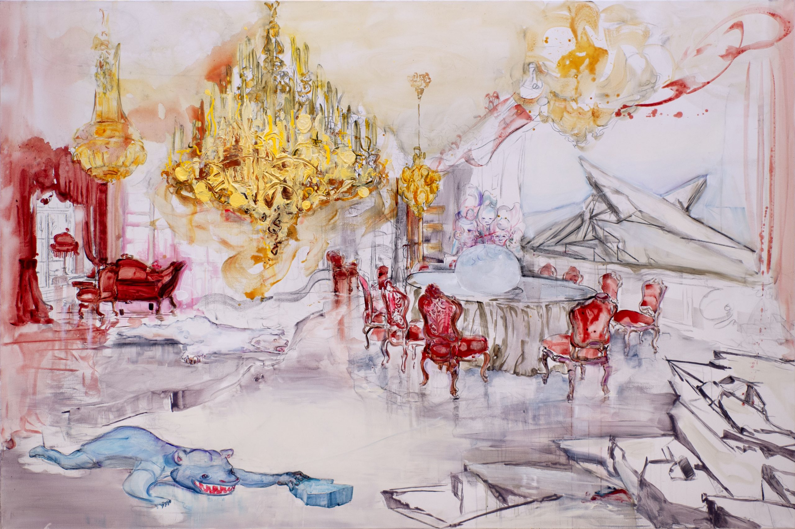Figur und Farbkulisse. In opulenten Schlössern, die an Versailles denken lassen, aber auch an die Schauplätze von Schauergeschichten herrscht eine nur schwer fassbare Wirklichkeit der Verwirrungen. Sie schafft eine Malerei, die sich jeder glatten, stubenreiner Ästhetik widersetzt. Die Farbströme in den Gemälden werden zu einem Symbol für das Vermischen von Wirklichkeiten, für die Durchlässigkeit zwischen körperlicher und gedanklicher Welt. Das Wesen in diesen Räumlichkeiten wirkt wie ein architektonisches Ornament.